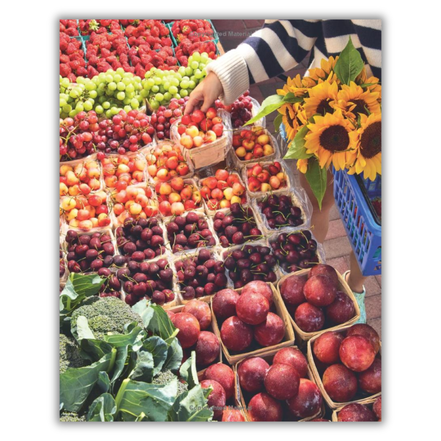 Market scene with fruits and vegetables, including a hand picking cherries.